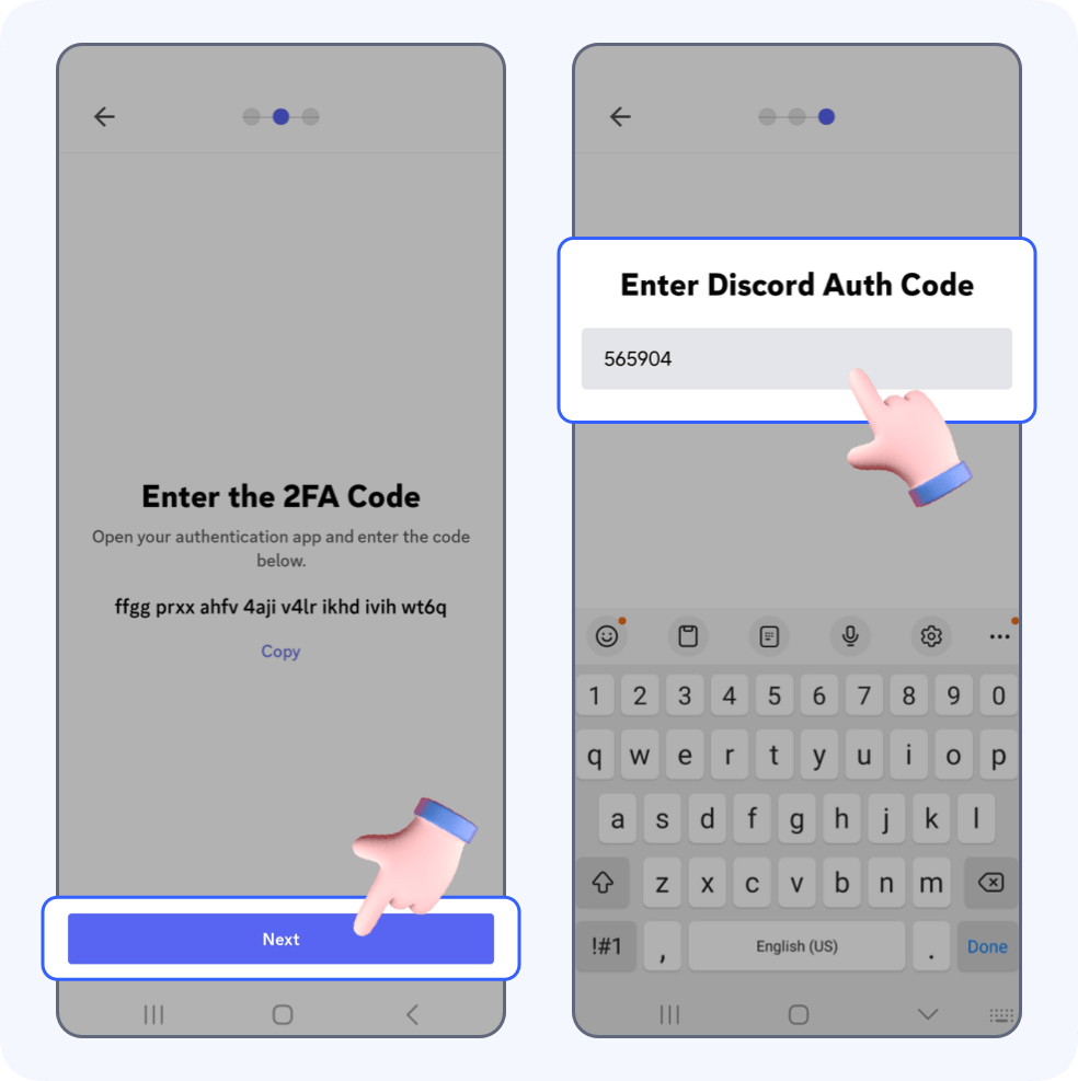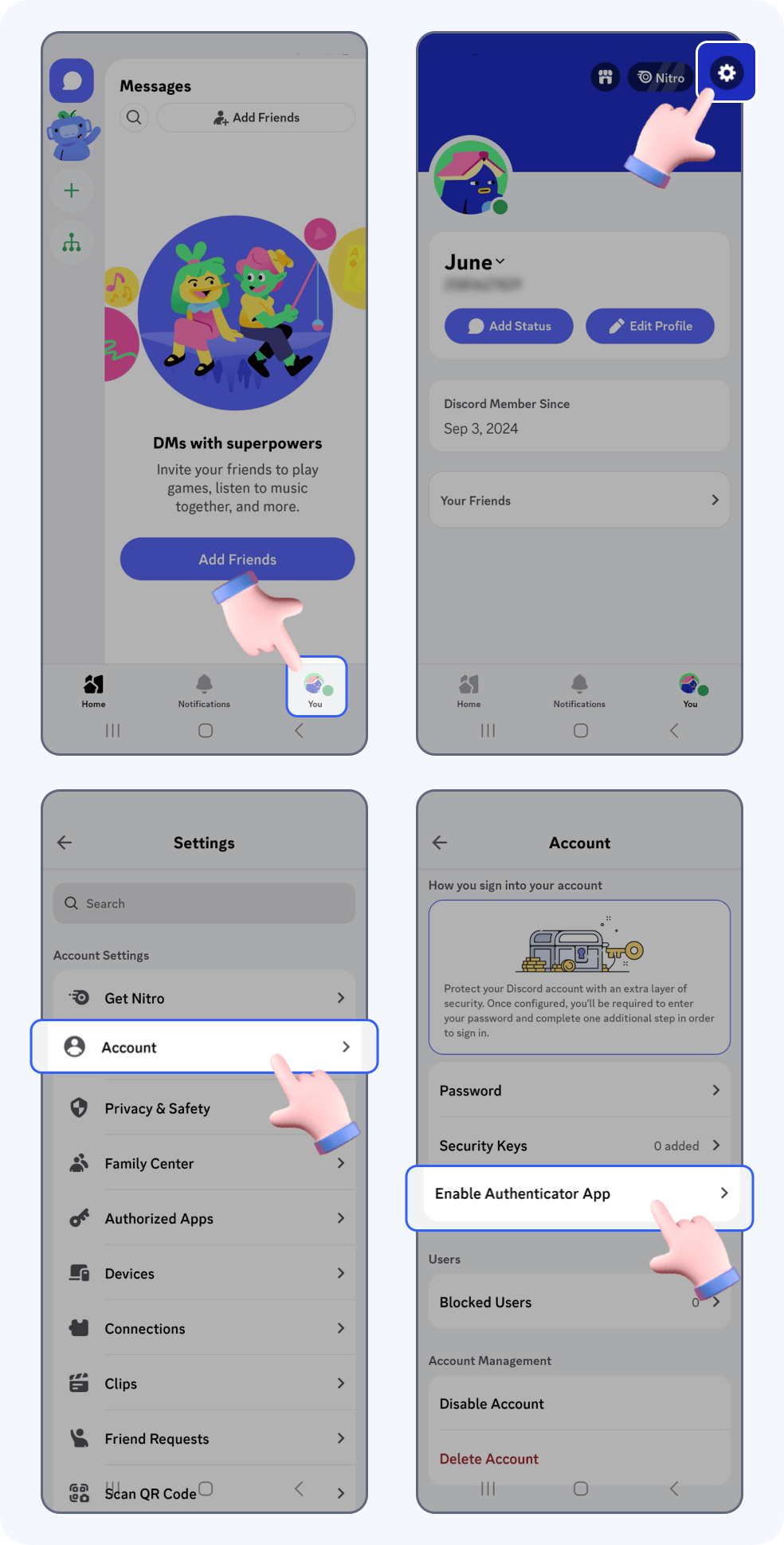 Open Discord, tap the Profile icon in the right corner, then tap -> Setting -> Account -> Enable Authenticator app.