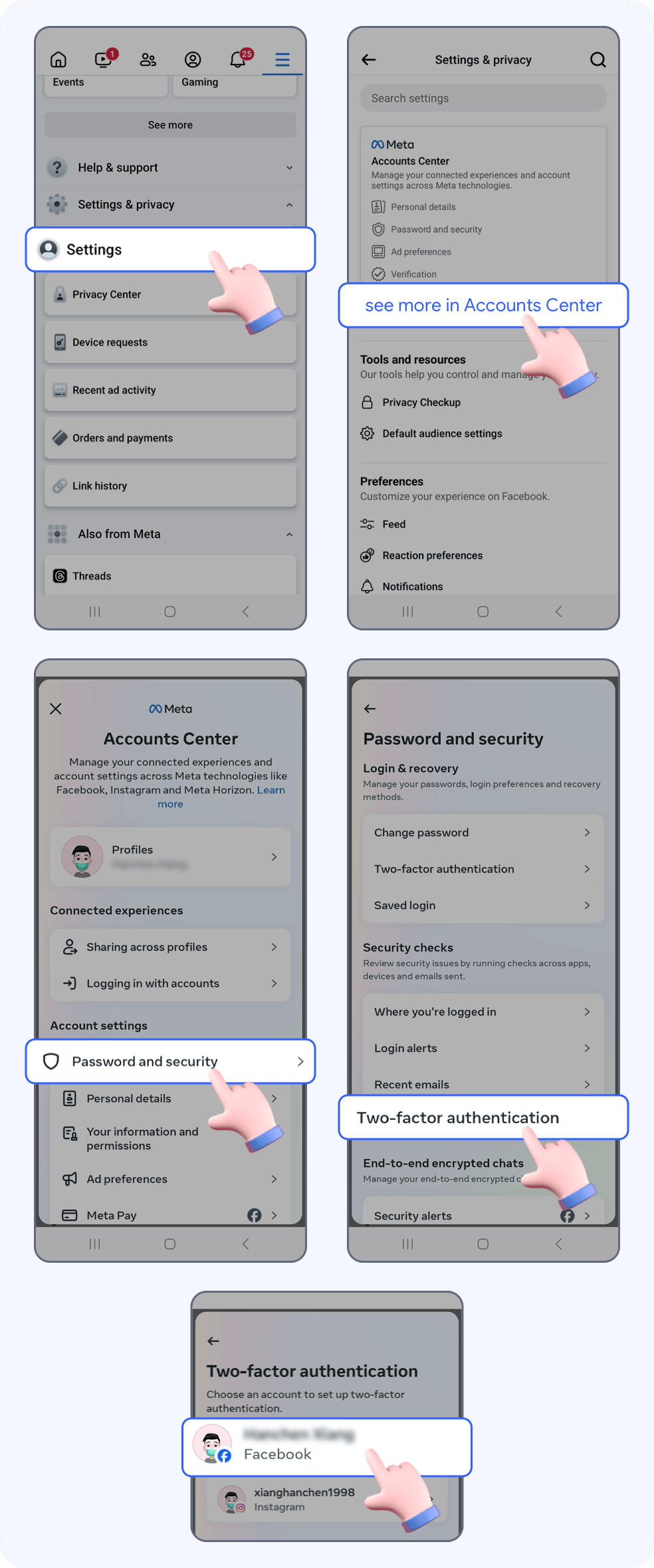 Tap Settings -> See more in Accounts Center -> Password and security -> Two-factor authentication -> select your Facebook account