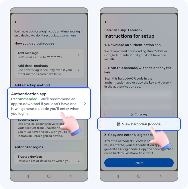 Choose Authentication app -> tap View barcode/QR code
