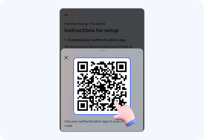 Now you can see a QR code. It’s used to scan and save your Facebook account to Authenticator.