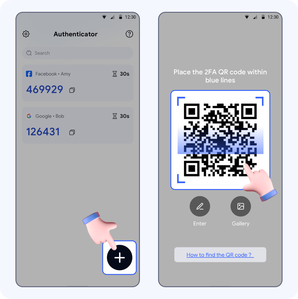 Open Authenticator -> tap +, to automatically scan the QR code page, then click the Enter button