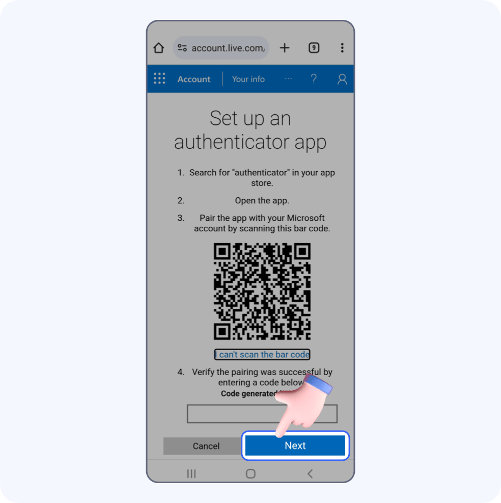 Return to Microsoft, enter the code in the input field, click Next.