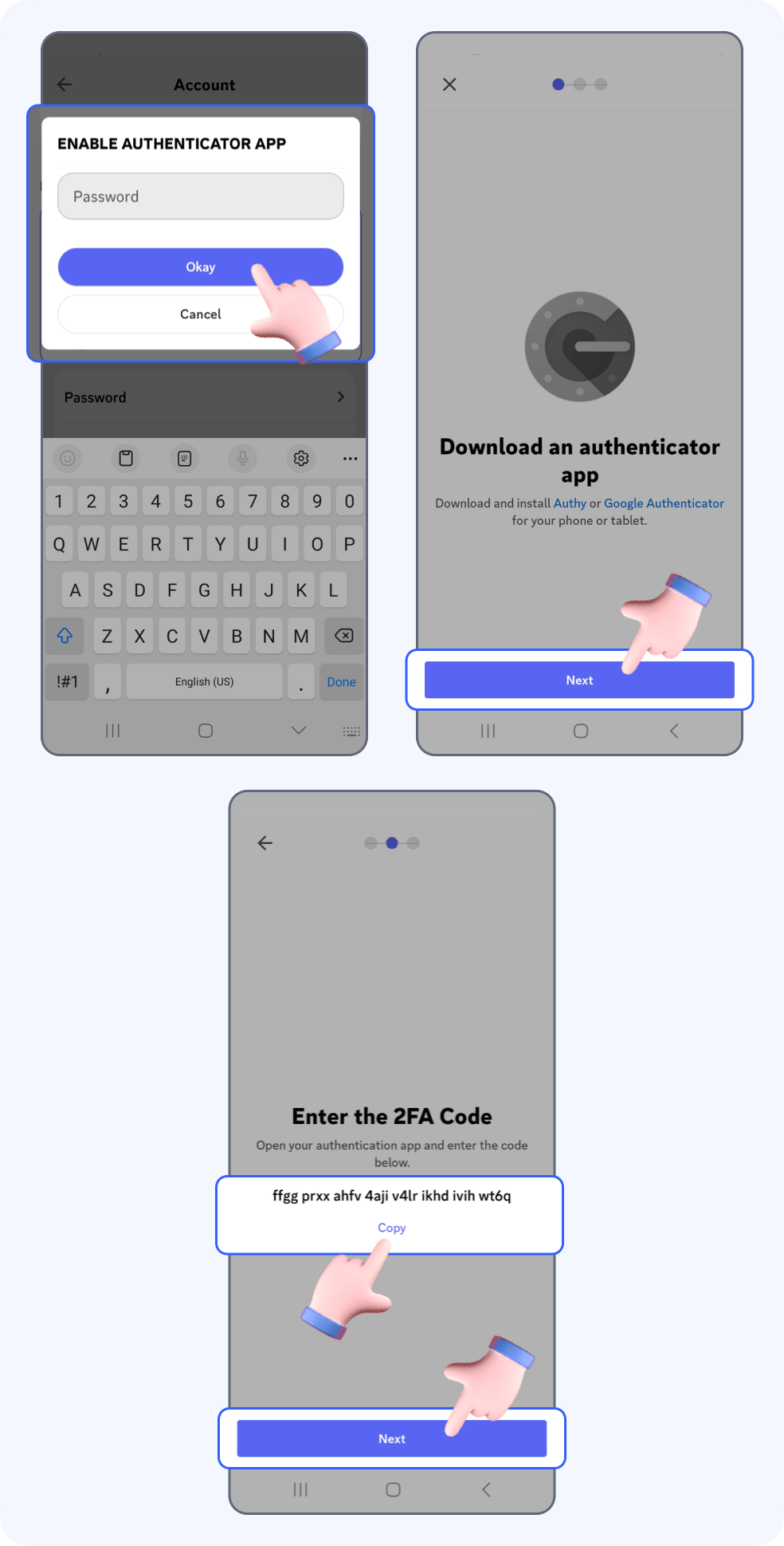 Open Discord, tap the Profile icon in the right corner, then tap -> Setting -> Account -> Enable Authenticator app.