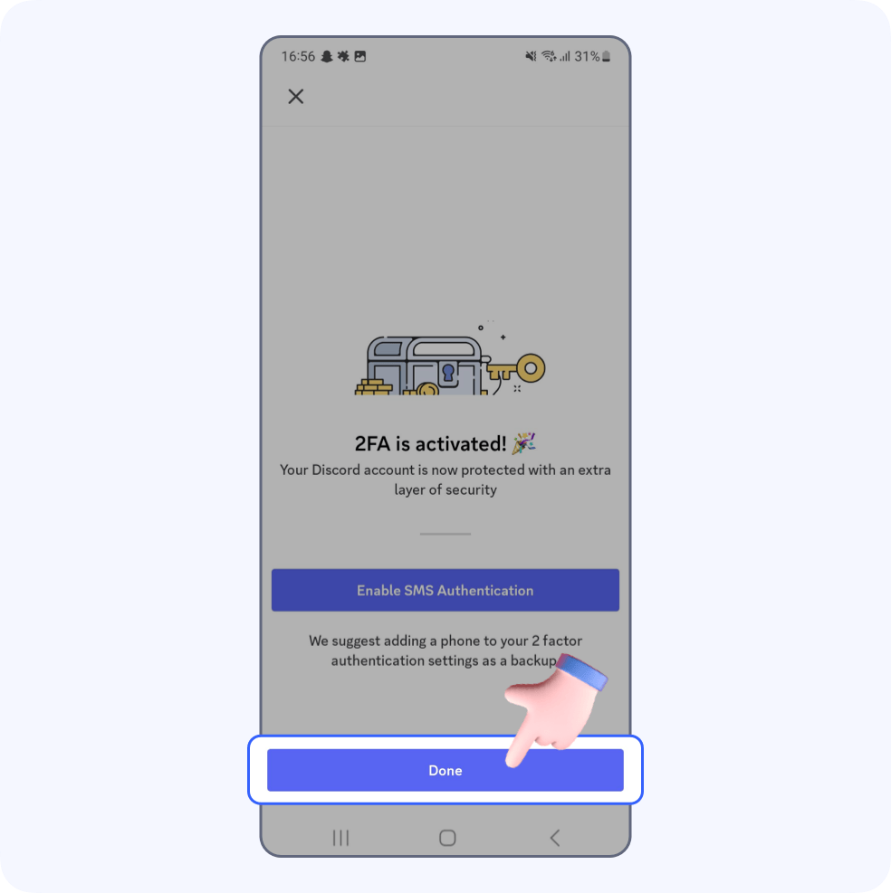 🎉Tap Done, you’re all set! Two-factor authentication is successfully turned on for your Discord account.