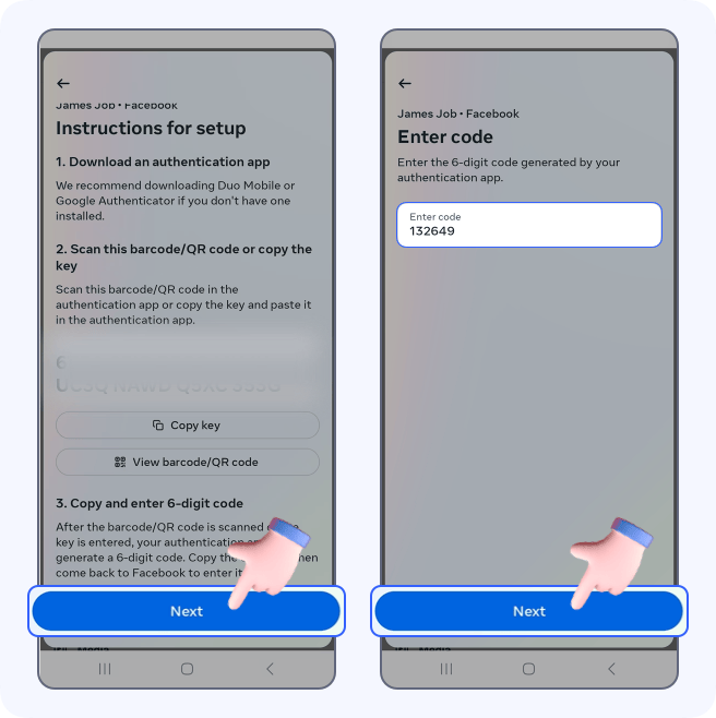 Go back to the device where you logged into Facebook > tap Next -> enter the code -> tap Next.