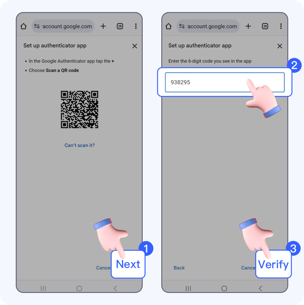 Return to Google, click Next, enter the 6-digit code and click Verify.