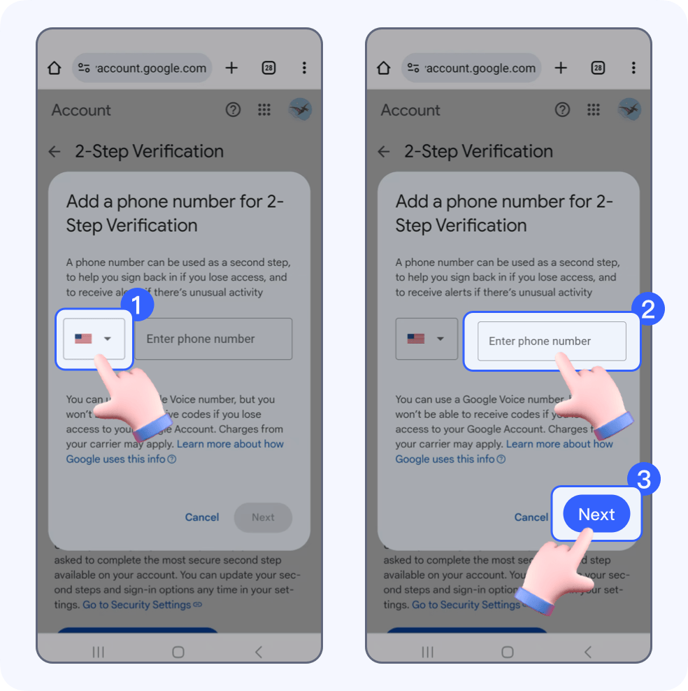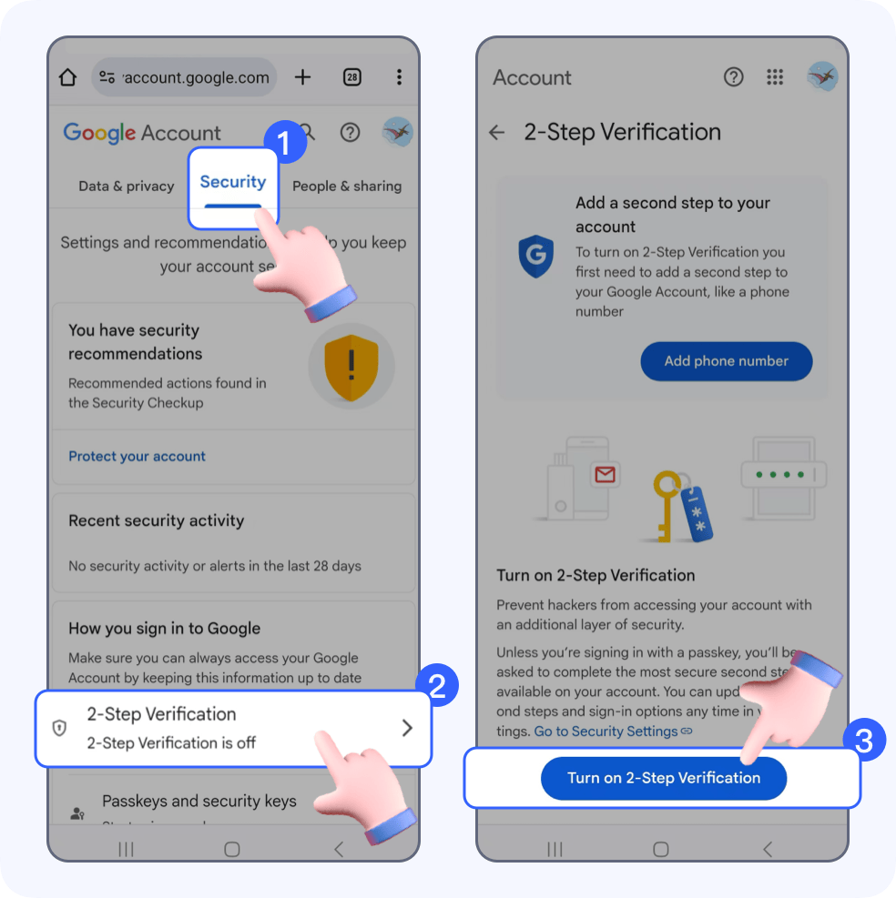 Click Security -> 2-Step Verification -> Turn on 2-Step Verification