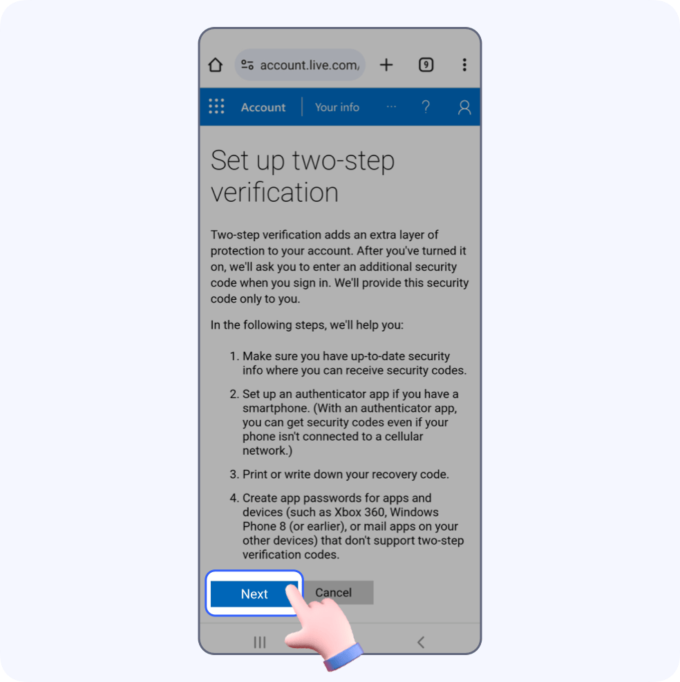 You'll see two-step verification instructions, just click Next.