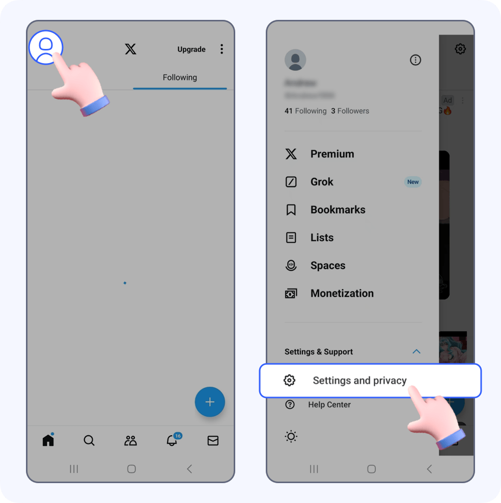 Open Twitter, tap the Profile icon in the upper left corner, then tap Settings & Support -> Settings and privacy.