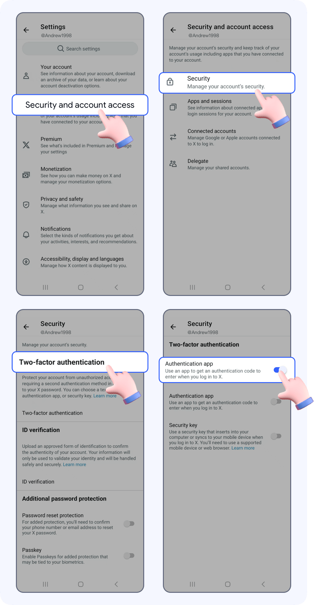 Tap Security and account access -> Security -> Two-factor authentication -> enable Authentication app